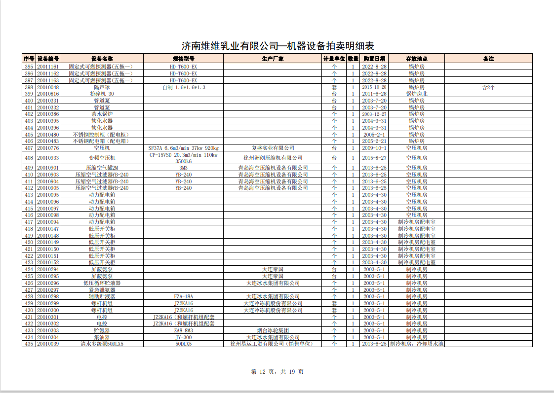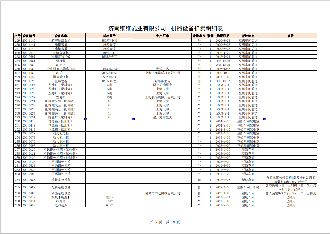 主要包含:牛奶生產(chǎn)設(shè)備、豆奶生產(chǎn)設(shè)備、利樂(lè)無(wú)菌灌裝設(shè)備、各型不銹鋼儲(chǔ)罐和發(fā)酵罐、鍋爐、烘干設(shè)備、空調(diào)、變壓器、配電設(shè)備、倉(cāng)儲(chǔ)設(shè)備等。