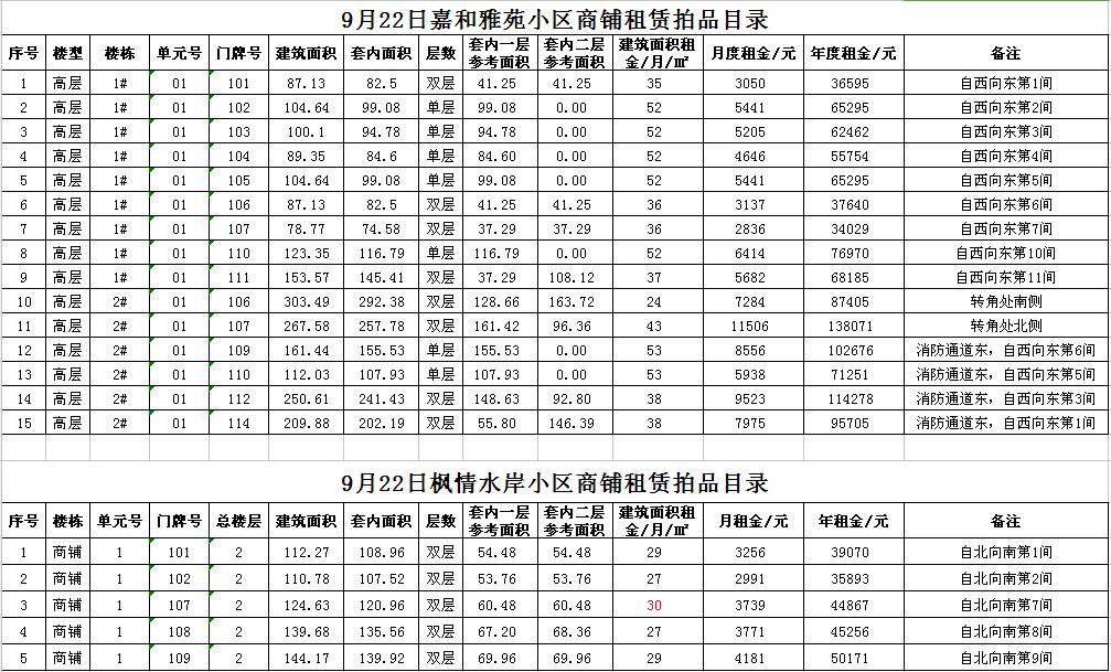 我公司受委托,定于2017年9月22日10時在本公司拍賣廳對以下小區(qū)門面房進行公開拍租: