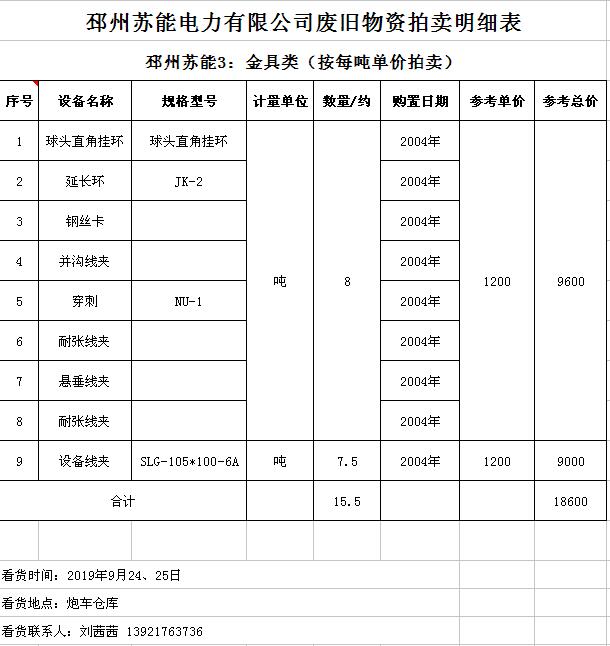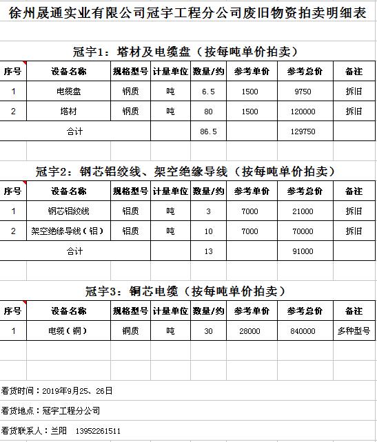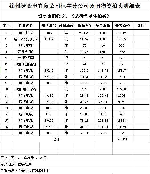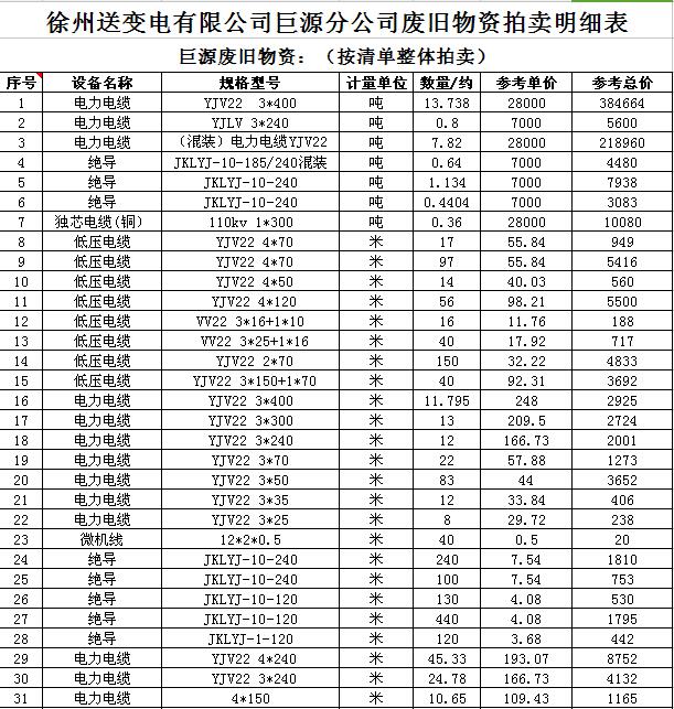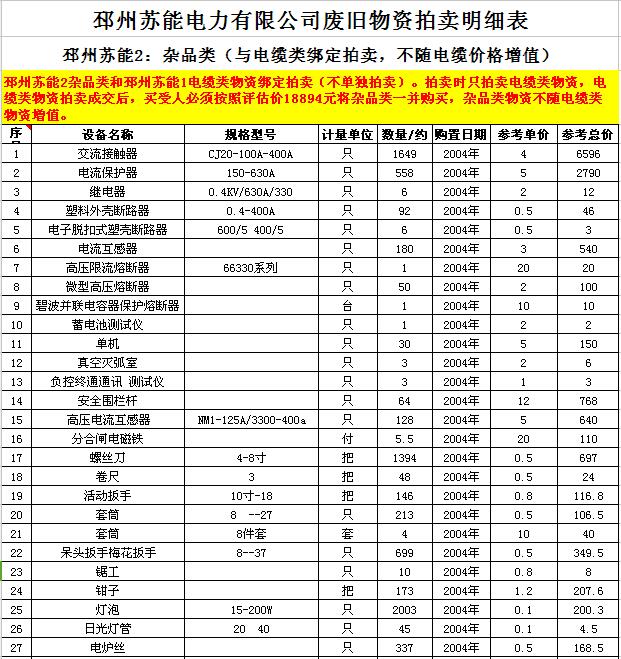 關(guān)注微信公眾號(hào)受委托,我公司將通過中國拍賣行業(yè)協(xié)會(huì)網(wǎng)絡(luò)拍賣平臺(tái)以網(wǎng)絡(luò)競價(jià)的方式公開拍賣廢舊電力物資一批,主要包括:電纜、導(dǎo)線、廢舊鋼材、鋼芯鋁絞線、金具、雜品、機(jī)具、空調(diào)、辦公設(shè)備等。