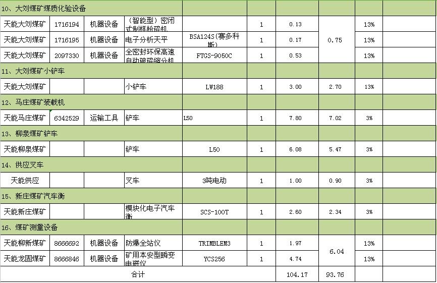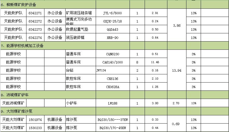 裝載機(jī)、通風(fēng)機(jī)、綜掘機(jī)、變壓器、鏟車(chē)、叉車(chē)、排沙泵、汽車(chē)衡、繪圖儀、救護(hù)設(shè)備、機(jī)械加工設(shè)備、測(cè)量設(shè)備等。