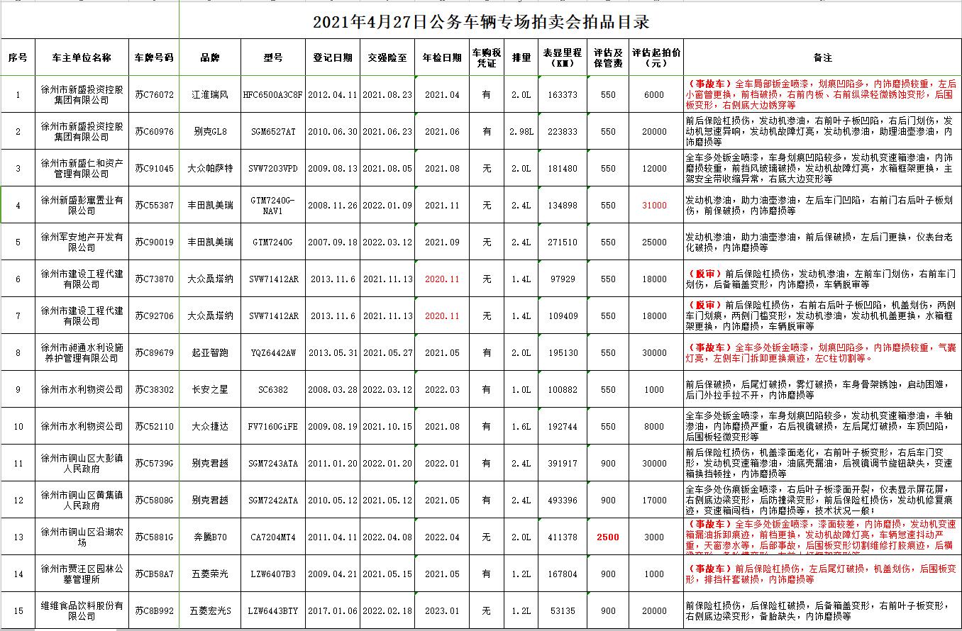 4月22日、23日在徐州中山飯店停車場(chǎng)及徐州銀地二手車交易市場(chǎng)展示。有意競(jìng)買者請(qǐng)持有效證件到我公司辦理報(bào)名手續(xù),并交納每輛車1萬元保證金即可參拍,報(bào)名截止至4月26日16時(shí)。