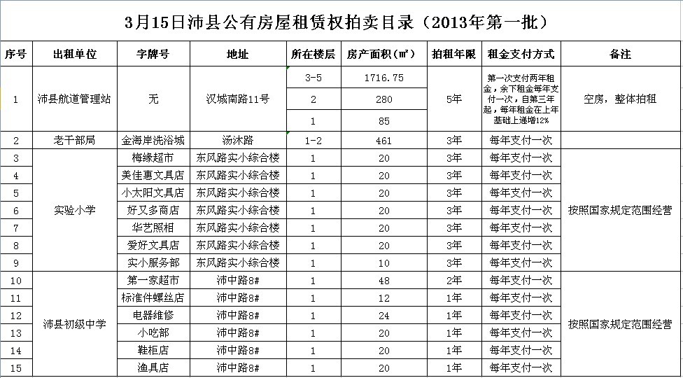 我公司受委托,定于2013年3月15日10:30時在徐州中山南路55號拍賣沛縣以下公有房屋租賃權(quán):
